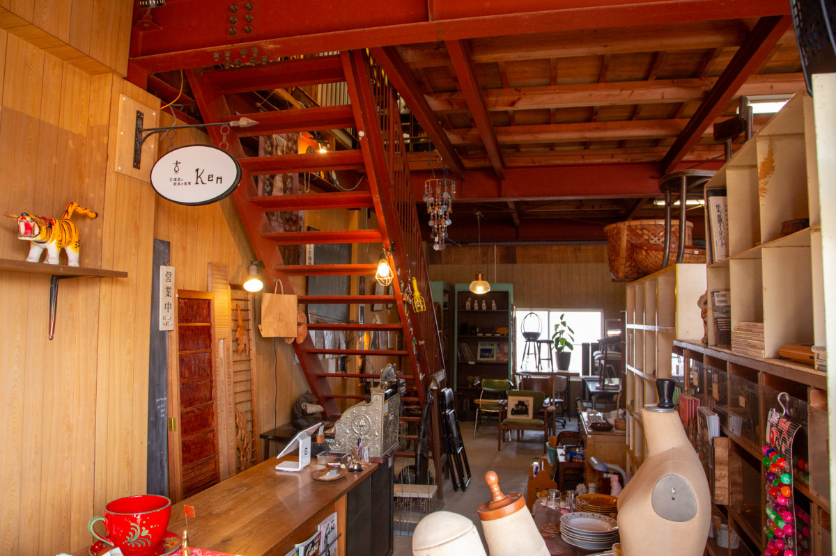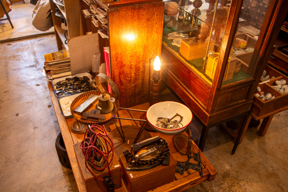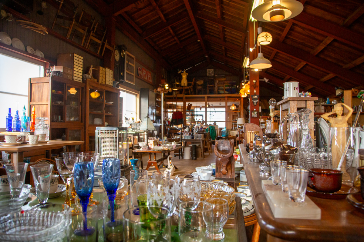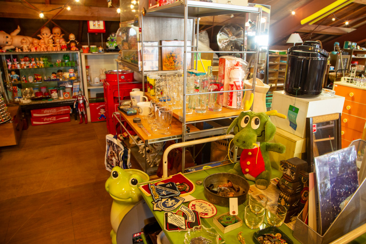 飯田町の静かなエリアにある倉庫型の店舗で、今回案内役を務める古市店長自身が営む店舗。「倉庫」という名の通り、広い空間には、家具や食器、香川漆器や奉公さんなど香川県の郷土品、おもちゃ、芸術展のフライヤーなどジャンルも豊富な1万点以上の古道具が並ぶ。