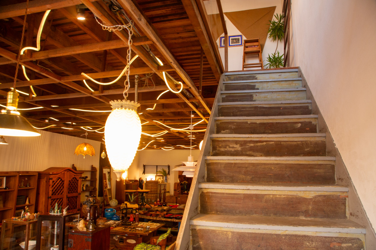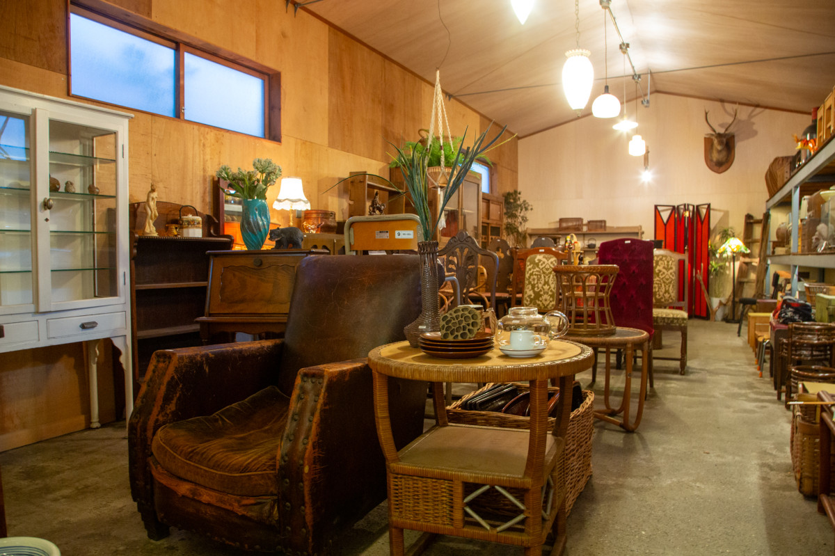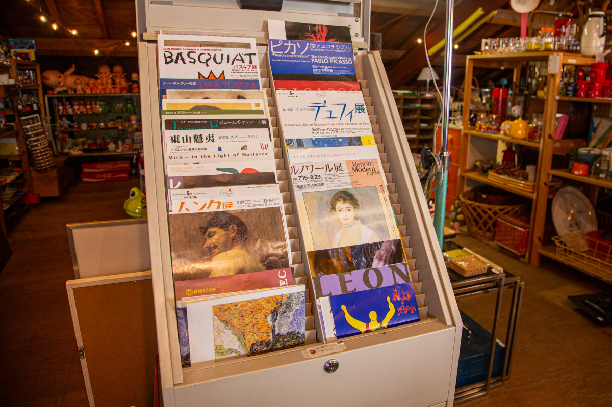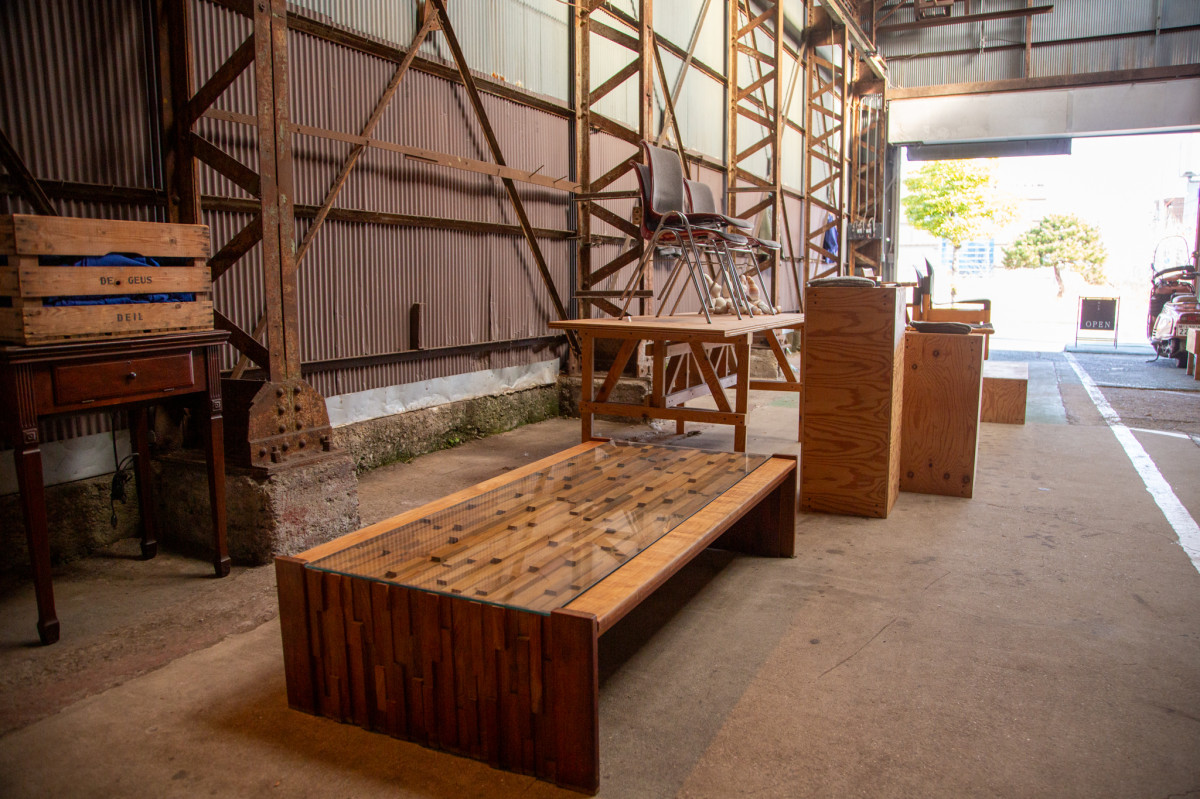 飯田町の静かなエリアにある倉庫型の店舗で、今回案内役を務める古市店長自身が営む店舗。「倉庫」という名の通り、広い空間には、家具や食器、香川漆器や奉公さんなど香川県の郷土品、おもちゃ、芸術展のフライヤーなどジャンルも豊富な1万点以上の古道具が並ぶ。