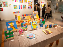 色とりどりの動物を描いた作品が並ぶ会場=丸亀町グリーンで高校生アーティストによる「ふたご展」