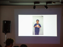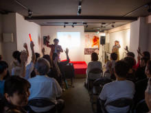 近藤真彦さんの歌に合わせて踊りながら現れた小西さん=小西マサテルさんが地元・高松でトークイベント