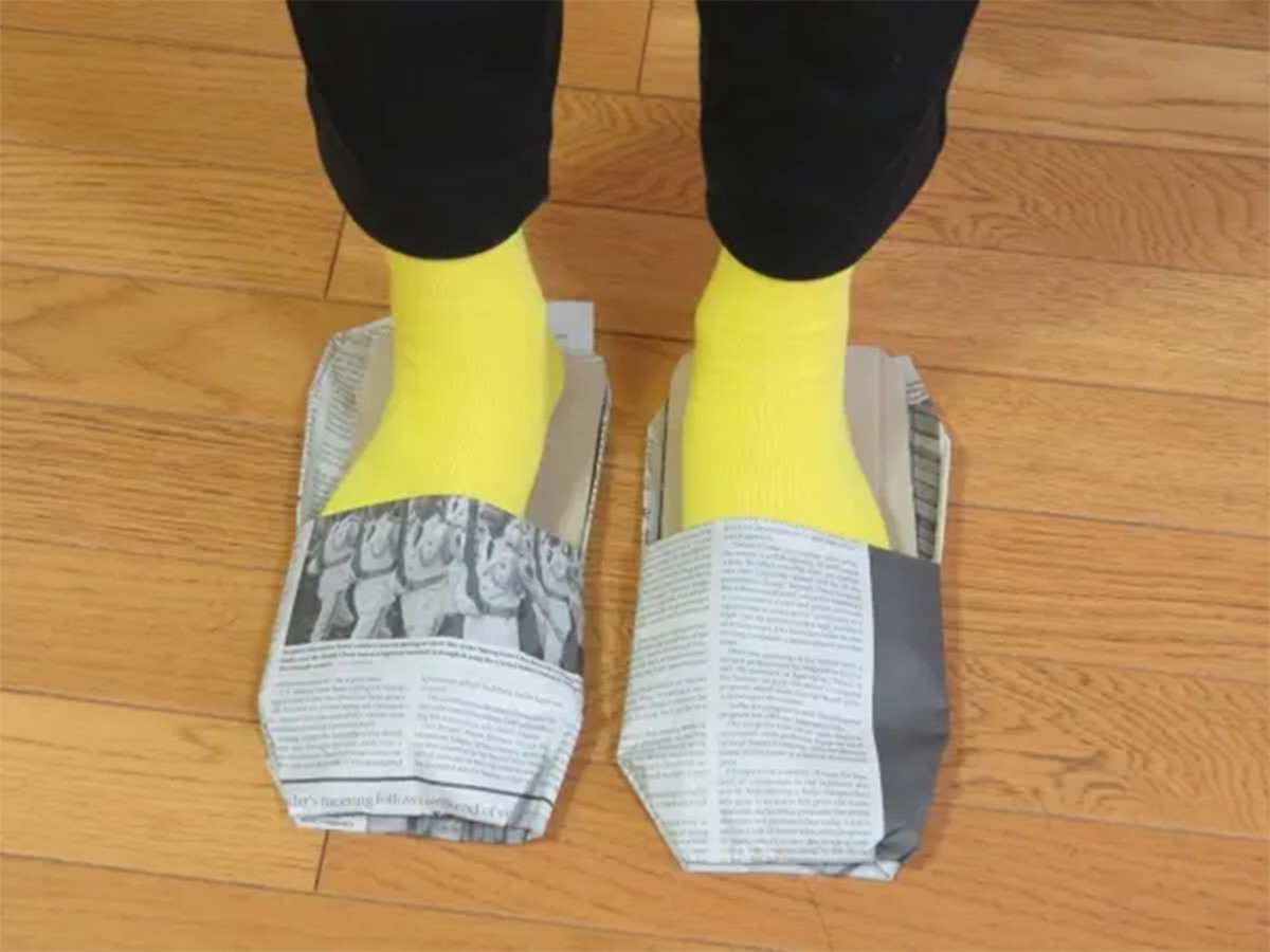 新聞紙で作るスリッパイメージ=坂出で親子防災体験イベント「BOUSAIミッケ」