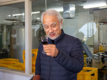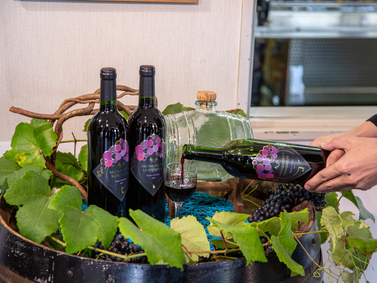 グラスに注がれる「ソヴァジョーヌ・サヴルーズ」 濃い色が特徴=香川大ブランドワイン「ソヴァジョーヌ・サヴルーズ」、新酒解禁