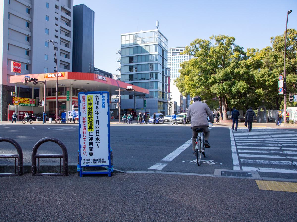 高松市中心部の中央通りと菊池寛通りが交差する「菊池寛通り(中央公園南)交差点」で1月28日、信号機を「歩車分離式」に変更する社会実験が始まった。