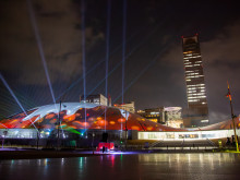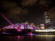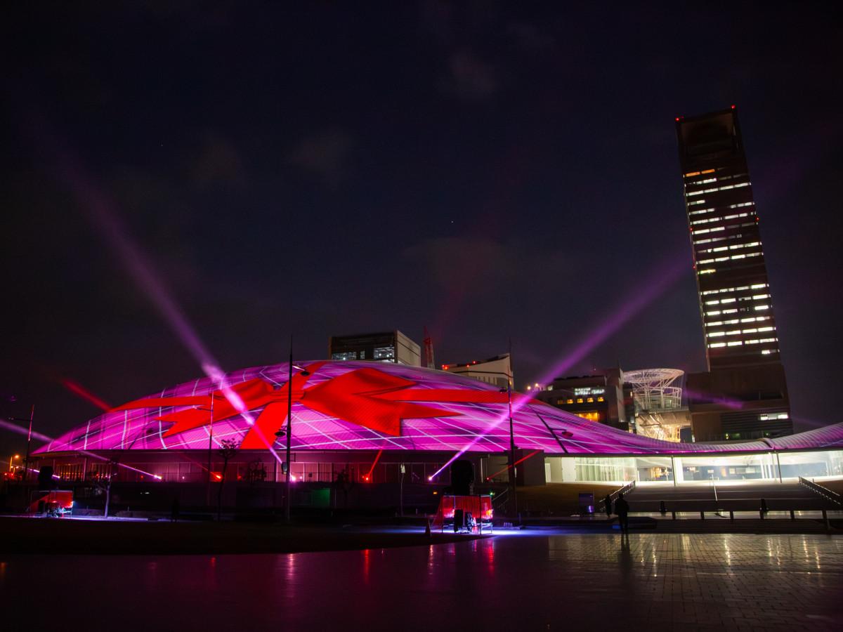 高松市のあなぶきアリーナ香川(高松市サンポート)で2月13日、建物の外壁を活用したプロジェクションマッピングの投影が始まる。