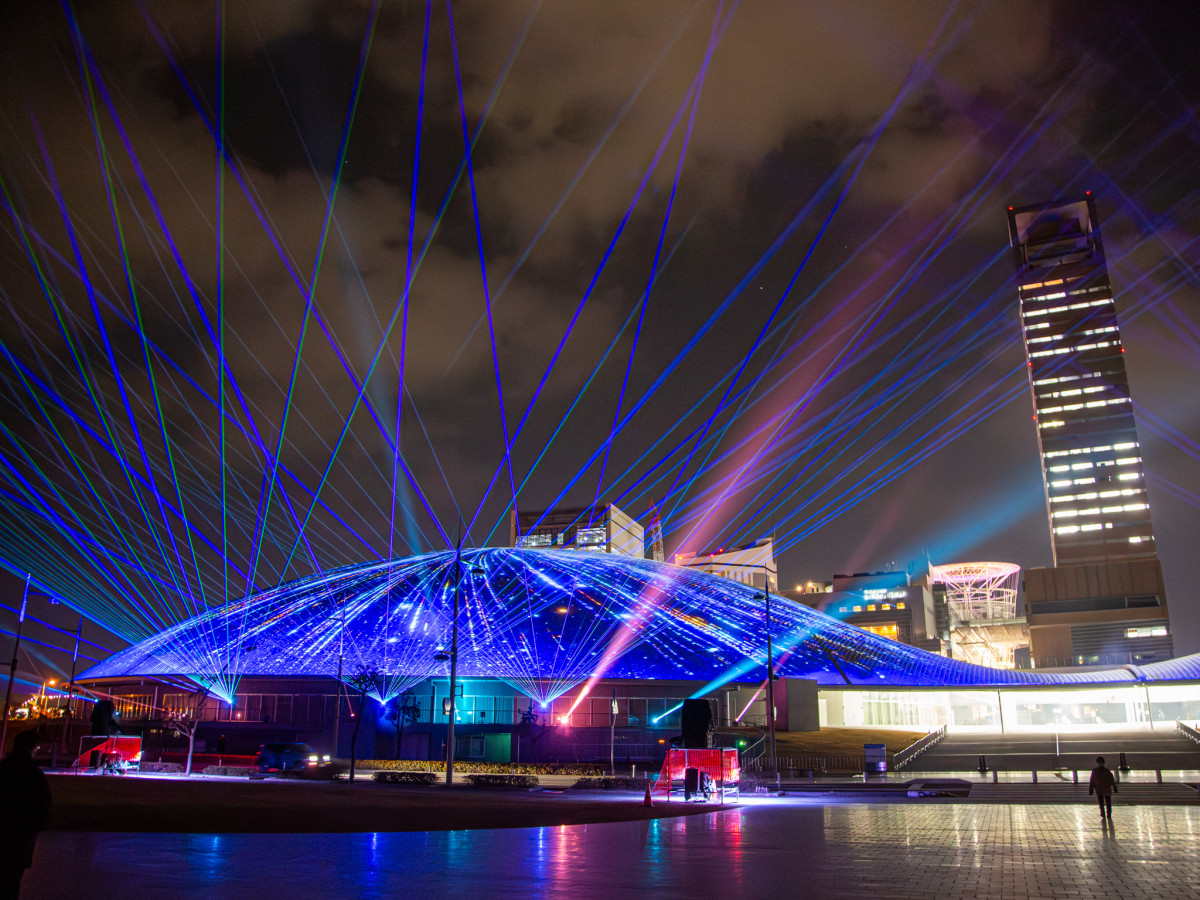 映像に加え、レーザー光線やムービングライトが夜空を彩る=香川県立アリーナでプロジェクションマッピング バレンタイン題材に