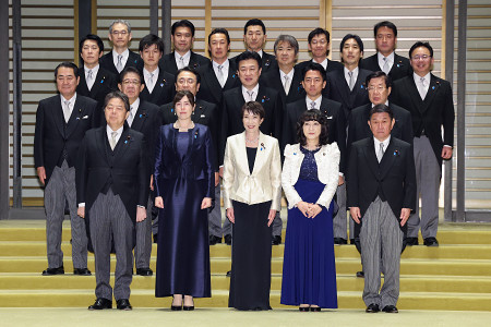 首相親任式、閣僚認証式を終え、記念写真に納まる高市早苗首相(前列中央)と閣僚ら=18日午後、皇居 【時事通信社】