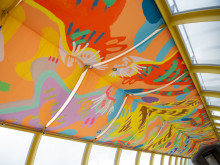 高松空港の旅客機へ向かう通路「固定橋」の天井に10月9日、香川県出身のテキスタイルデザイナー・磯野藍さんのアート作品「往古来今」が取り付けられた。