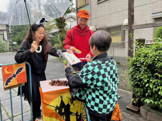 当日は空港1階の土産店「四季の里」や2階ホールを会場に、計3回のグリーティングを実施。ハロウィーンをモチーフにした衣装をまとった2体が登場すると、集まった家族連れや旅行客から歓声が上がった。子どもたちは元気よく「トリック・オア・トリート」と声をかけ、お菓子の詰め合わせを受け取った。うどん脳Fは口から舌を出したり、目をジャック・オ・ランタンや文字などに変える特技を披露したりして、会場を沸かせた。