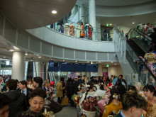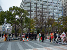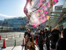 この日の高松市は強い寒波の影響を受け、式典が始まった13時の気温は3.2度と冷え込み、最大瞬間風速22.2メートルを観測。海沿いの会場周辺では晴れ着や髪を押さえながら足早に歩く参加者の姿が見られたが、会場内は再会を喜ぶ熱気に包まれた。