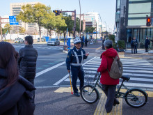 現場に立ち会った香川県警察の真鍋明弘さんは「事故は多くはないものの、右左折車と横断者の交錯が多く、危険性が課題として叫ばれていた。街中の回遊性も高めることを目的に今回の実証実験を行うこととなった」と話す。「スクランブル交差点化に向け、1年をかけて段階的な変更を伴う実証実験を行う。今回はその第1弾。今後、自転車横断帯を撤去するなどの変更も計画している。アンケートを行うなどして、歩行者の安全性と自動車交通への影響を詳細に調査し、変更を進めていく予定」とも。