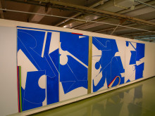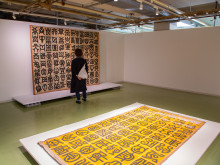会場では、渡米前に高層ビルから見下ろした家屋が並ぶ景色に着想を得て描いた初期作品や、工芸の技法を取り入れた絵画などを紹介。人体を抽象化した図形をグリッド(格子)に並べた作品や、幾何学的な図形を木材の組み合わせで表現した作品も展示する。中には、米国で買い手が付いたものの「サイズが合わずに飾れない」と言われたというスケールの大きな作品もある。