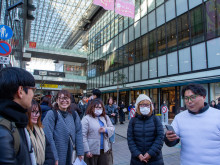 高松空港前 ゲスト「NON STYLE」の2人と撮影クルーと共に