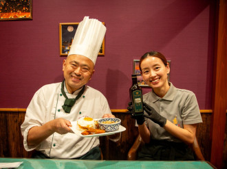 出張料理人でオリーブオイルソムリエの小暮剛さんが2月5日、来店客が料理に自由にかけて使えるオリーブオイルを高松のタイ料理店「サパン・タイ」(高松市瓦町2、TEL 087-861-6955)に寄贈した。