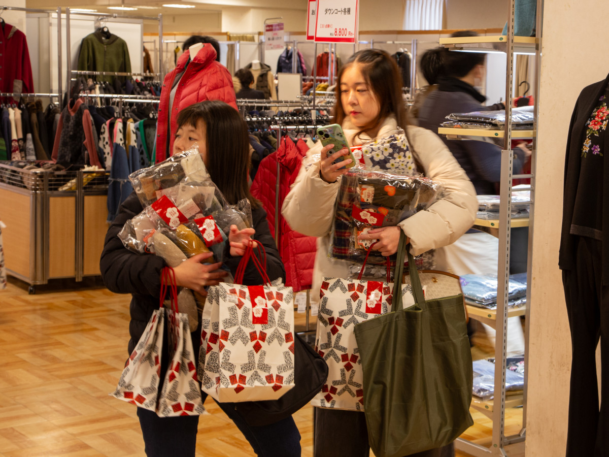 たくさんの買い物袋を抱える買い物客=高松三越で初売り 大谷翔平選手記念ボール販売も
