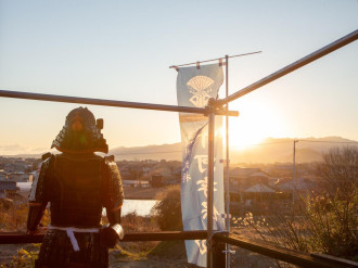 「十河の郷昭和おもひで館」(高松市十川東町)で1月1日、甲冑(かっちゅう)姿で初日の出を迎える恒例のイベントが行われた。