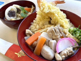 津田の松原サービスエリア(さぬき市)が1月1日から、香川県の「あんもち雑煮」を正月限定メニュー「あん餅雑煮うどん」「年明けうどん」などの提供を始める。