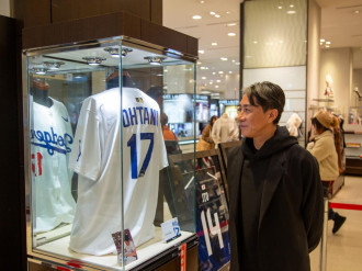 会場正面 今年米国野球殿堂入りを果たしたイチロー選手のユニフォームが正面に飾られている=高松三越で大谷選手ら直筆グッズ展 前園真聖さんも来場