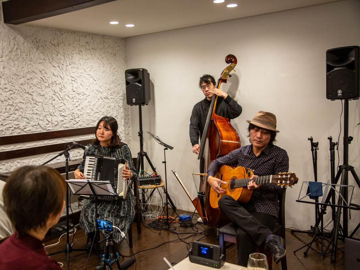 オープニングイベントで演奏した「Django Tigalle(ジャンゴ・ティガール)」=高松・藤塚町に「どれみふぁカフェ」