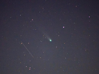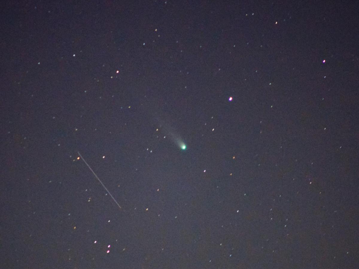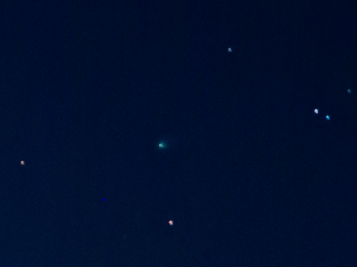 当誌記者が撮影した「レモン彗星」 中央で緑色に光っている=千年に一度のレモン彗星、地球に接近 高松でも緑の輝き観測