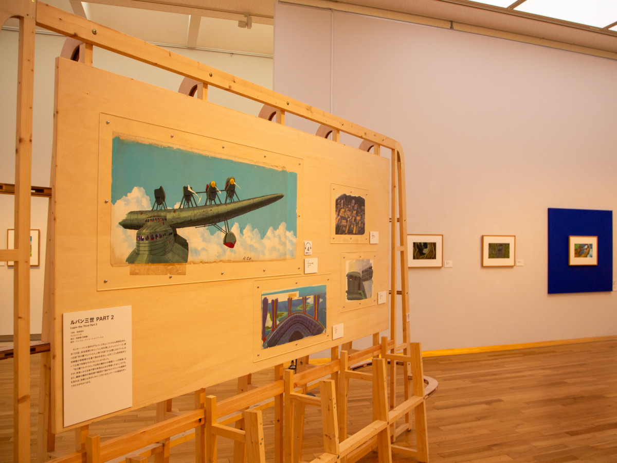 「冒険」のコーナー オブジェに貼られたアニメ「ルパン3世」の原画が目を引く=高松市美術館で「山本二三展」 ラピュタやもののけ姫、名作の世界を紹介