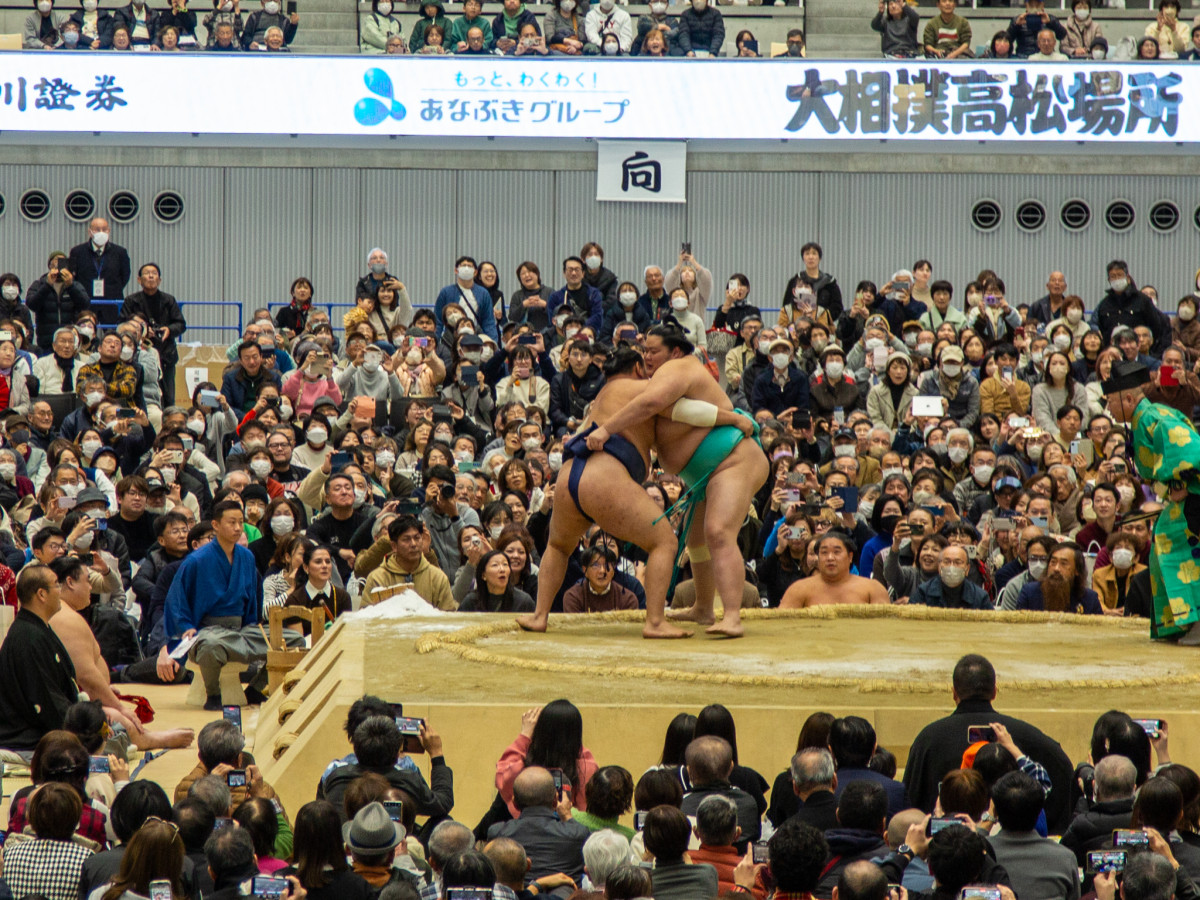 土俵際の攻防を見せた琴桜関(右)と豊昇龍関=あなぶきアリーナ香川で「大相撲高松場所」