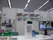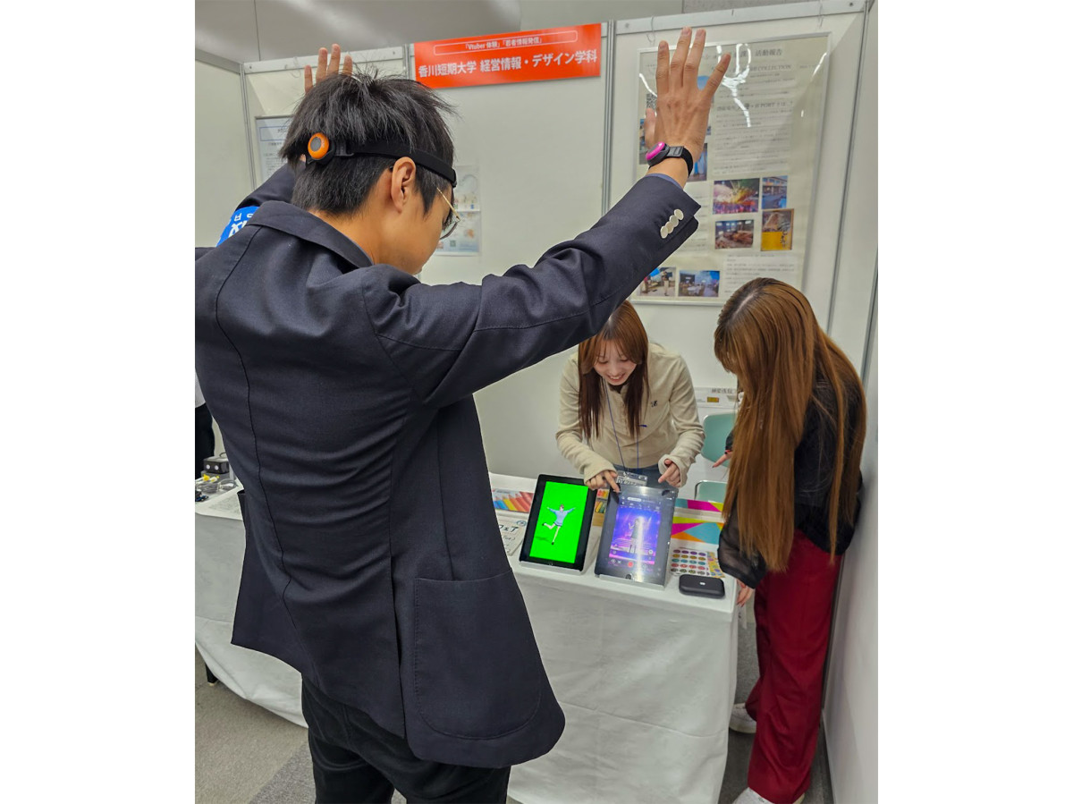 香川短期大学 経営情報・デザイン学科のブース 体の各所に取り付けたセンサーを感知して画面上のキャラクターが動く=高松で「かがわDXフェア」