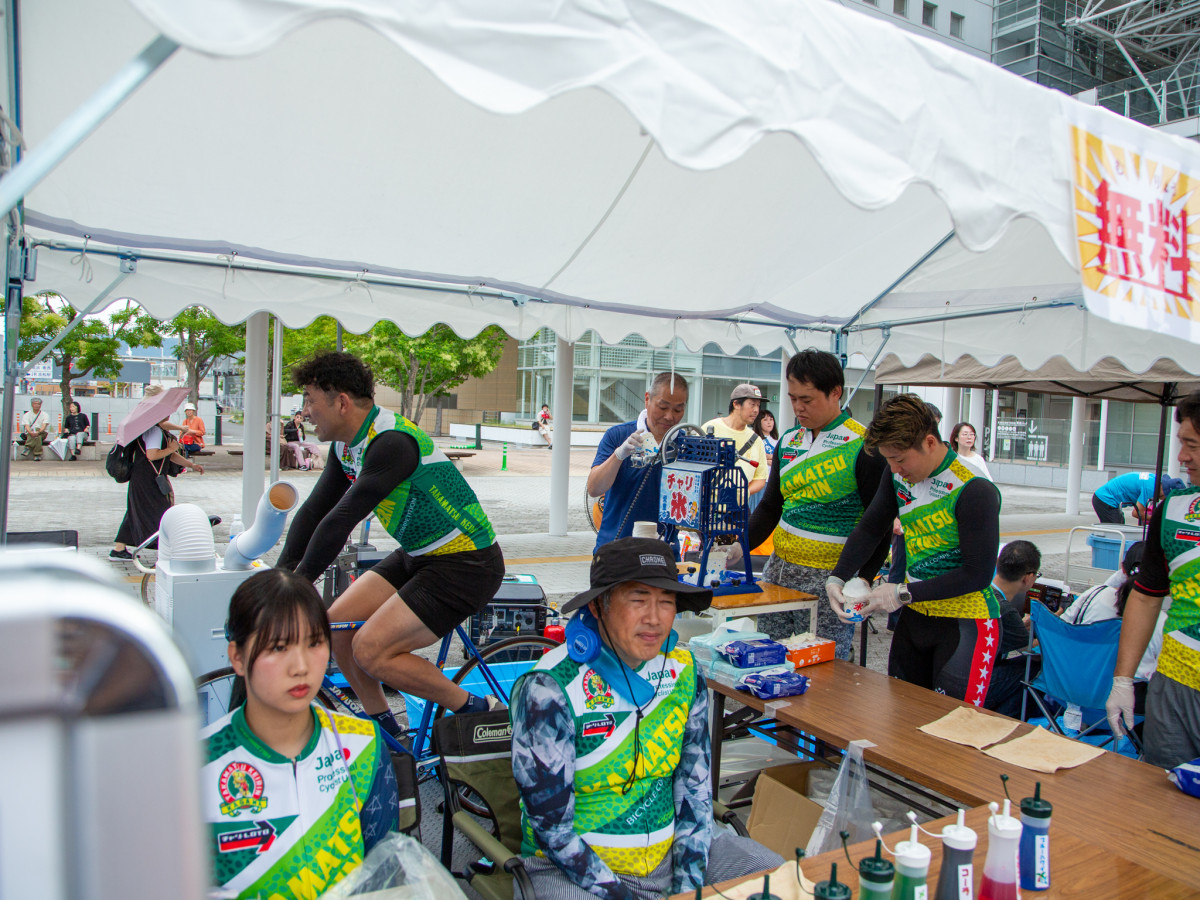 日本競輪選手会香川支部のブース 選手が自転車をこいで削って作ったかき氷「チャリ氷」を無料で提供した=サンポート高松で「かじ祭り」