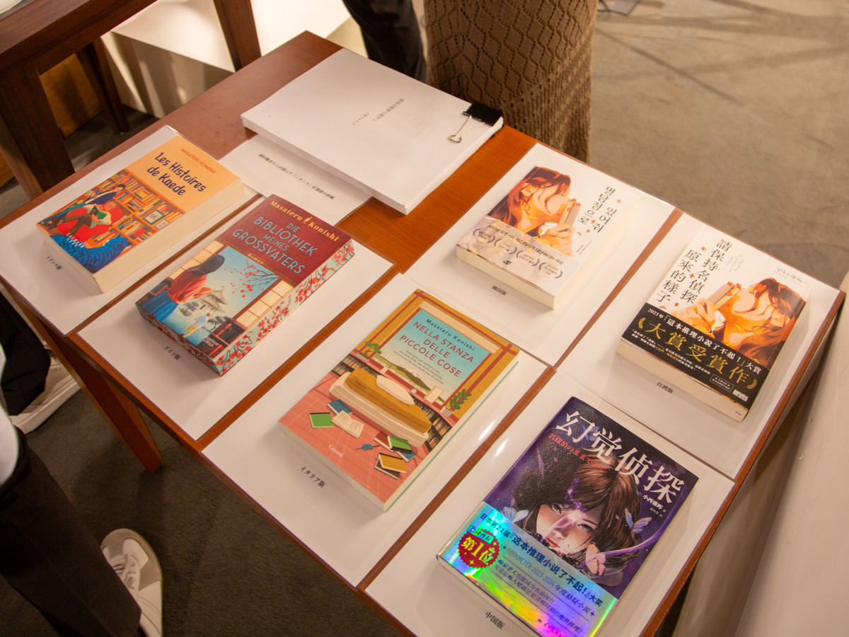 外国語翻訳版や1作目「名探偵のままでいて」の紙原稿も展示=小西マサテルさんが「名探偵にさよならを」出版記念に地元・高松でトークイベント