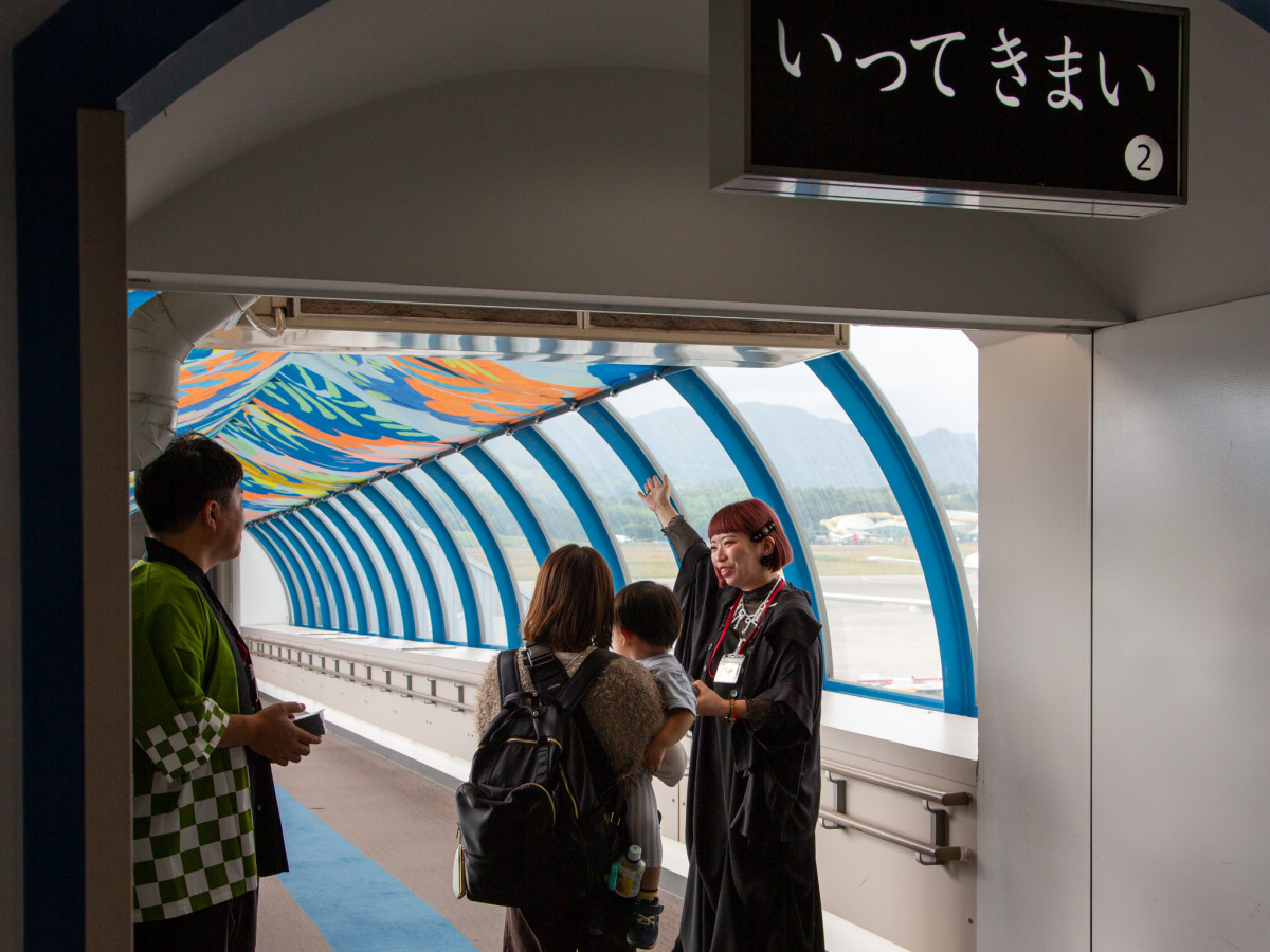 高松空港の旅客機へ向かう通路「固定橋」の天井に10月9日、香川県出身のテキスタイルデザイナー・磯野藍さんのアート作品「往古来今」が取り付けられた。