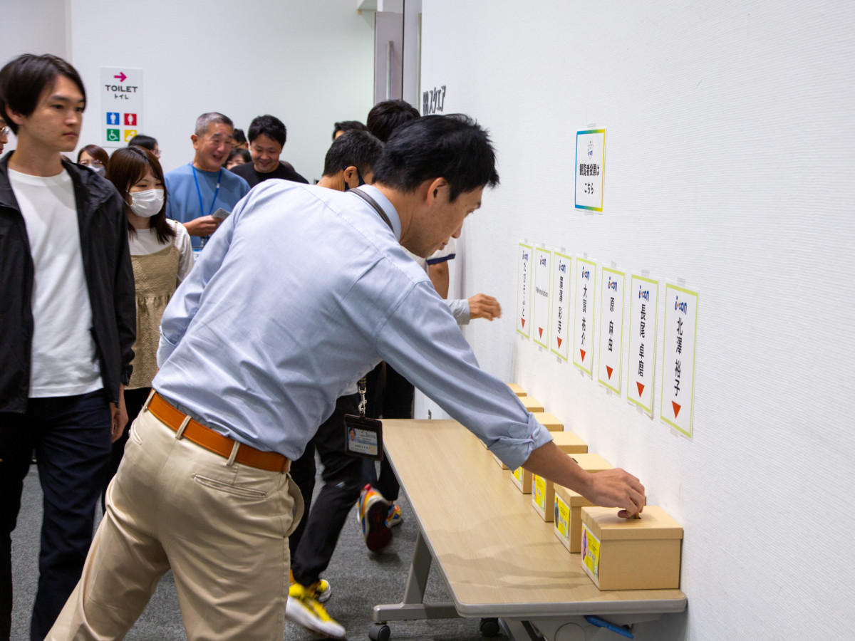 全ての発表が終わった後、応援したい参加者に木札を入れる観客ら=高松でビジネスアイデアコンテスト「かがわビジネスアイデアコンテスト i-Con」