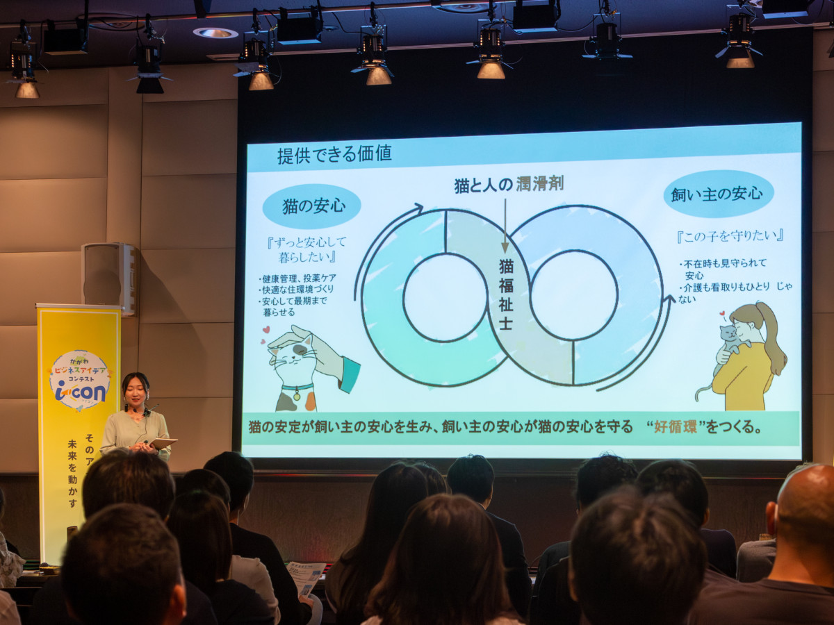 「猫福祉士」の育成プランについて発表する準グランプリの廣澤さん=高松でビジネスアイデアコンテスト「かがわビジネスアイデアコンテスト i-Con」