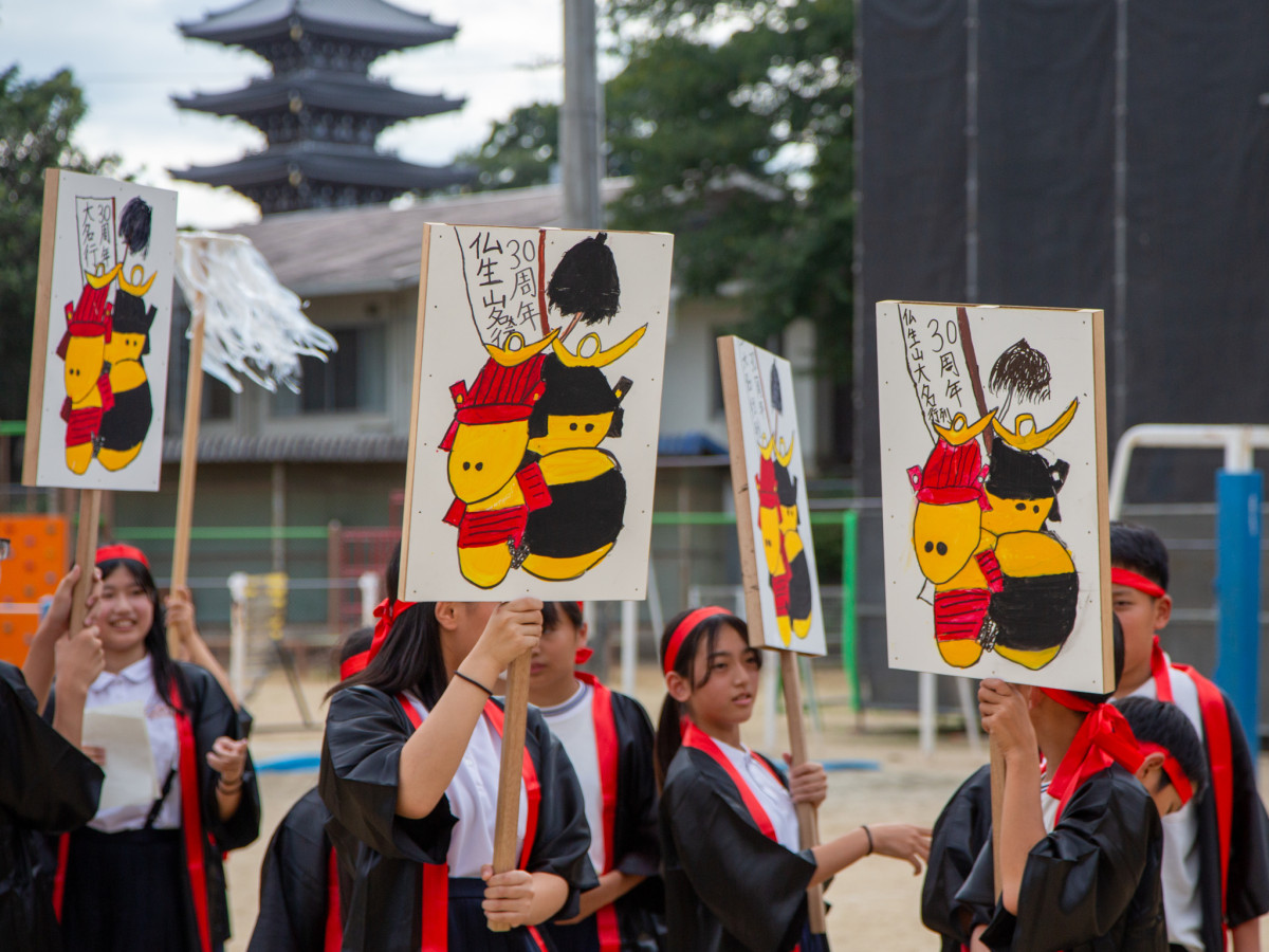 看板に印刷されたイベントキャラクター「武士じゃん」=高松の仏生山大名行列が30回目 地元小学生97人も参加