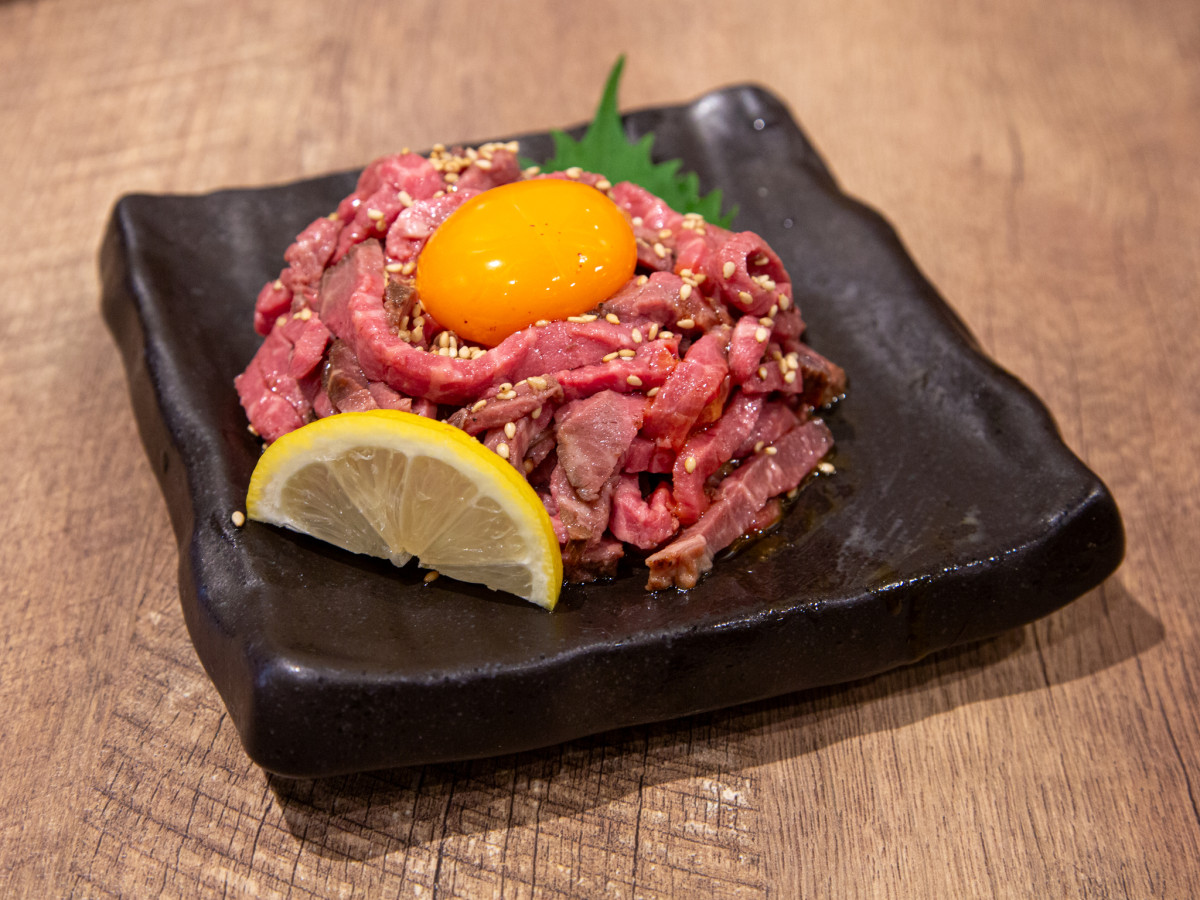 香川県産地鶏・讃岐コーチンの卵黄をのせた「直火焼きローストビーフのユッケ」=高松・ライオン通りに「骨付鳥一本がぶ丸」