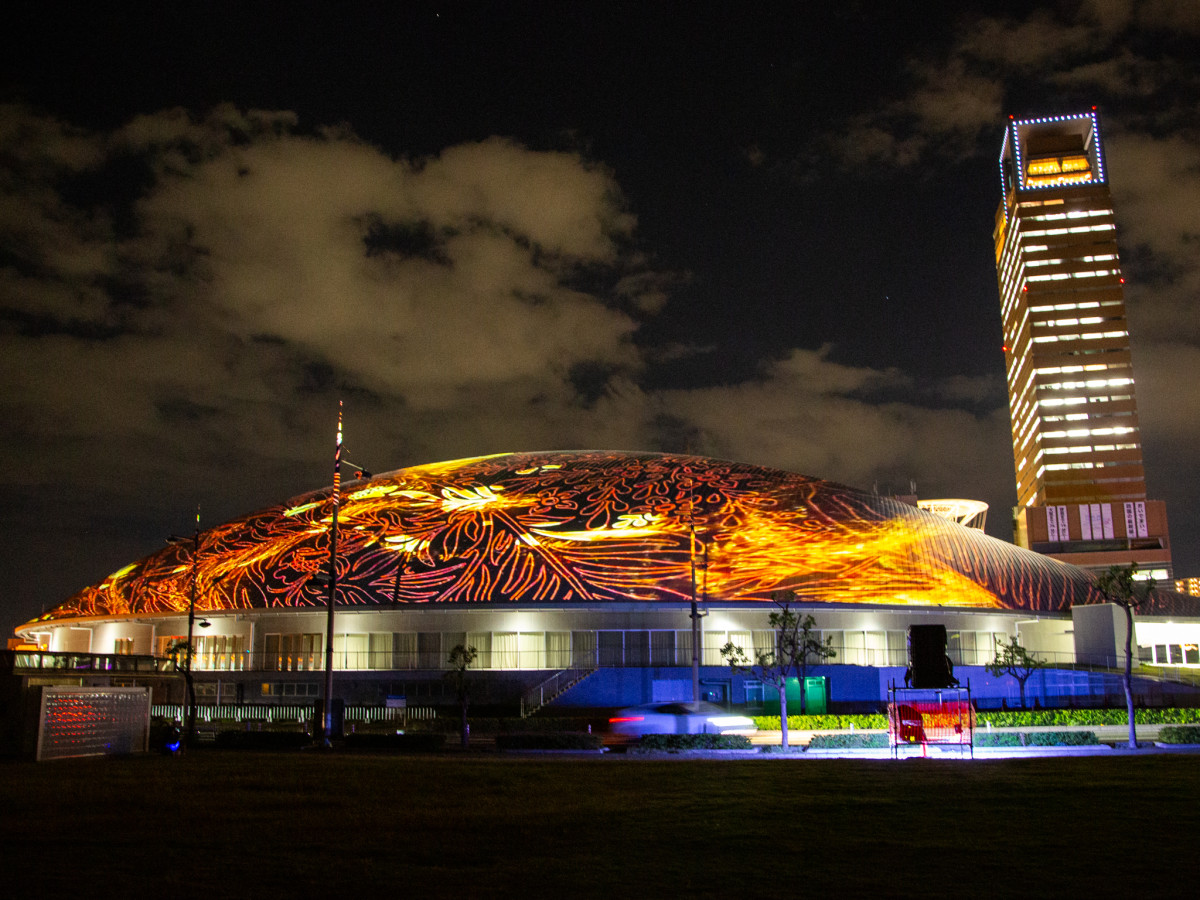 高松市のあなぶきアリーナ香川(高松市サンポート)で10月29日、アリーナ壁面を活用したプロジェクションマッピングの投影が始まる。