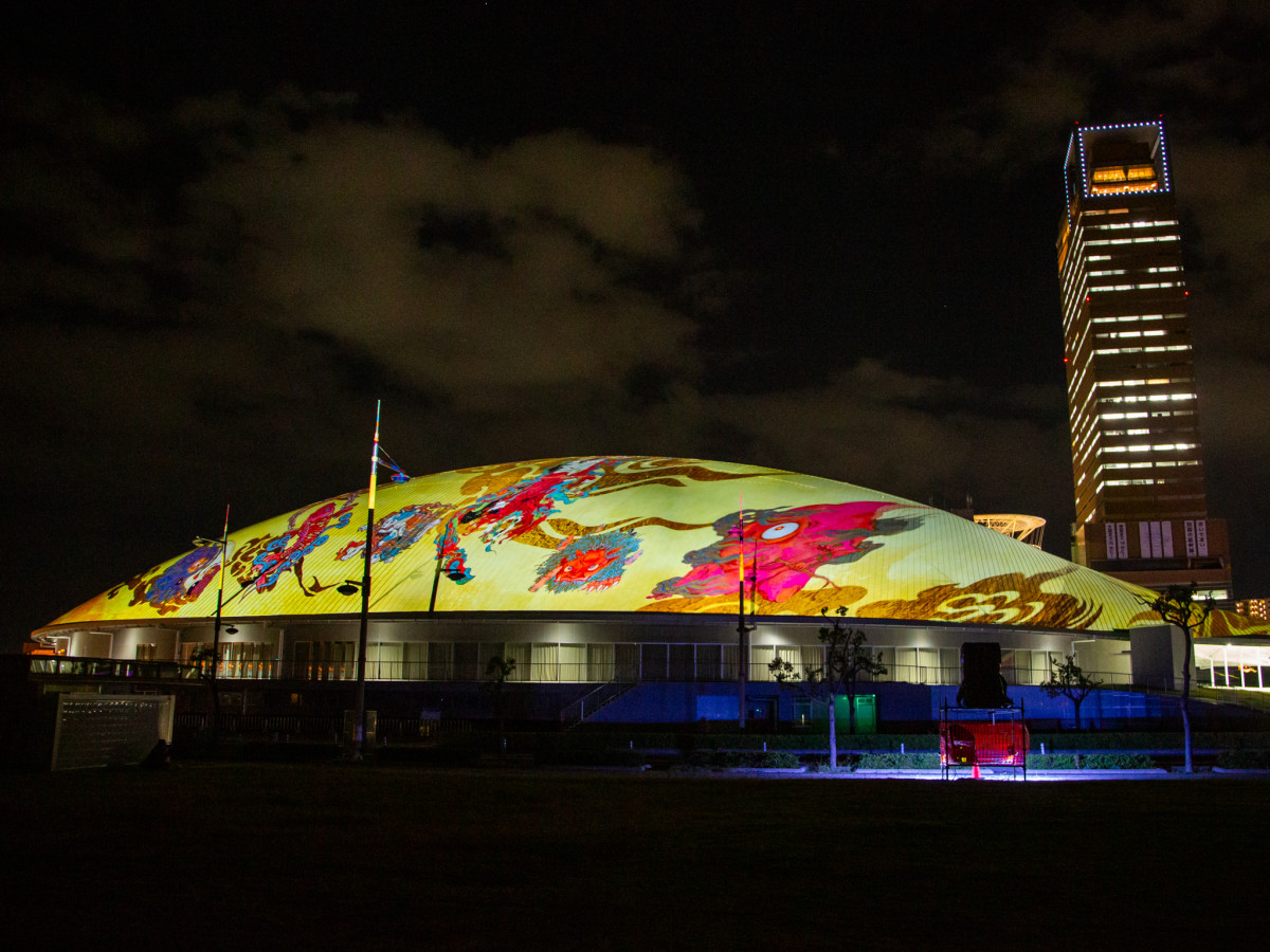 高松市のあなぶきアリーナ香川(高松市サンポート)で10月29日、アリーナ壁面を活用したプロジェクションマッピングの投影が始まる。