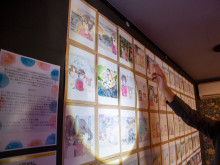 しっくいを使った新作 ホスピタルアートに取り組む中で感じたことを基に希望の光「きぼうや」を抱く「ぼうや」を描いた=高松「グリュック」で香川の3人アーティスト展「HAPPY展」