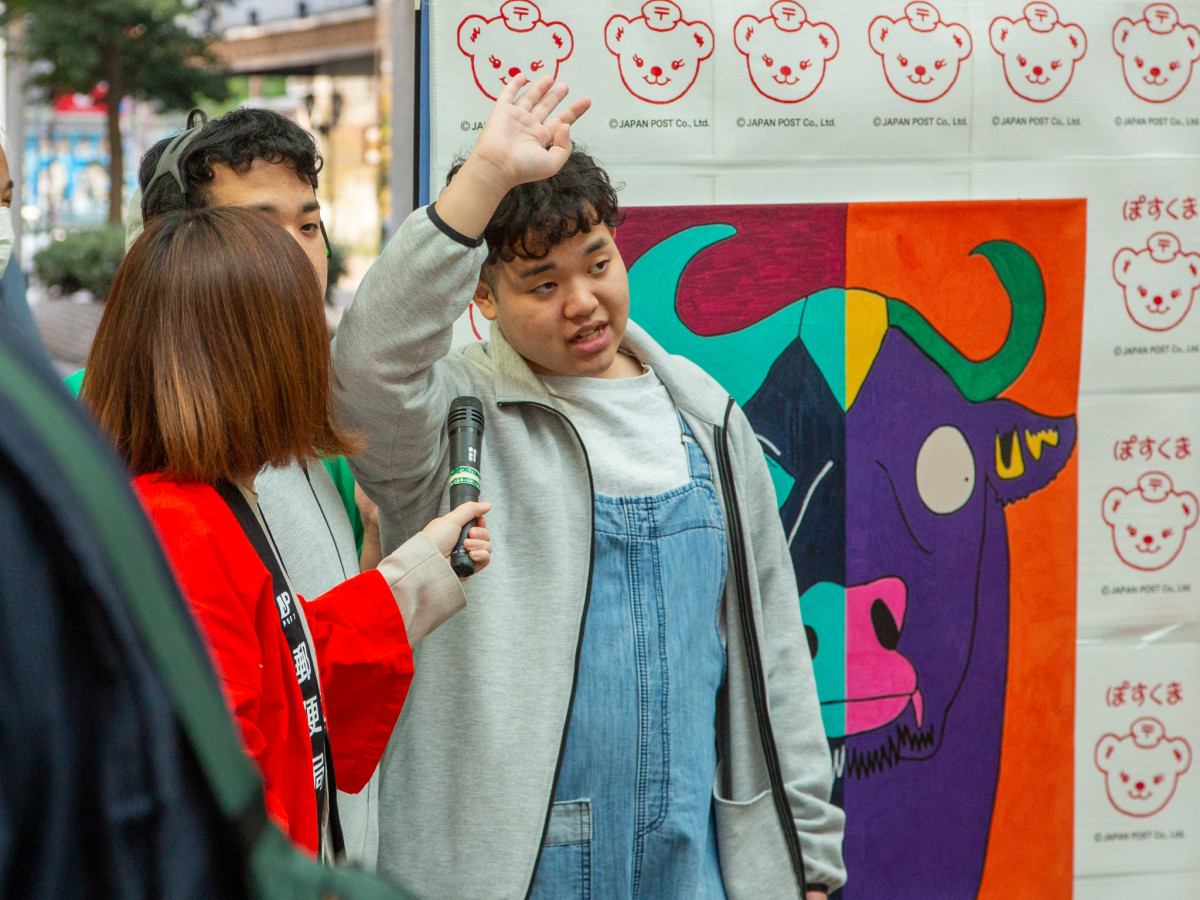 道行く人に年賀状を買うよう呼びかけるShotaさん=年賀はがき販売スタートで双子アーティストがライブペイント