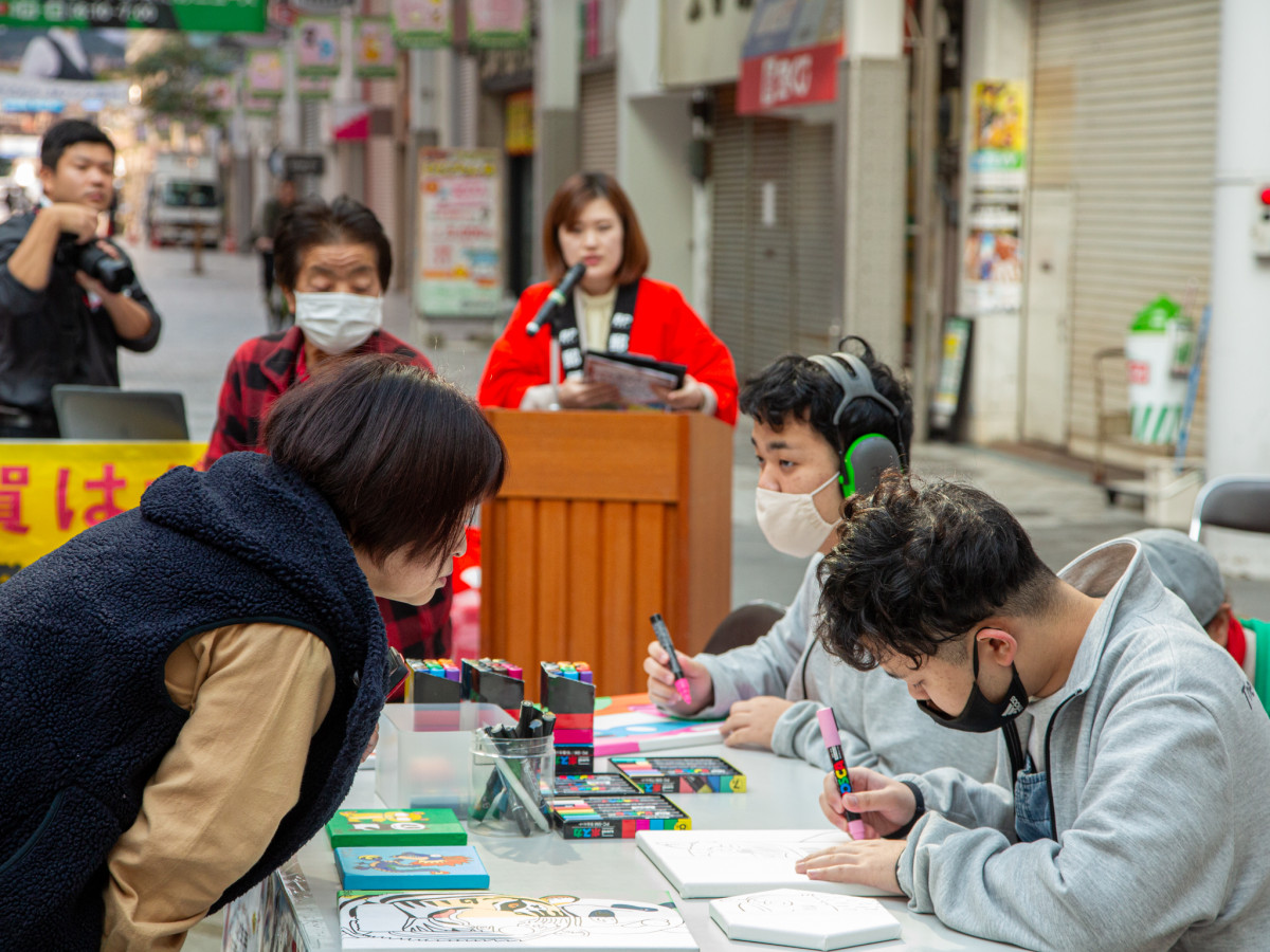 2人が制作する様子を間近で見ようとする人も=年賀はがき販売スタートで双子アーティストがライブペイント