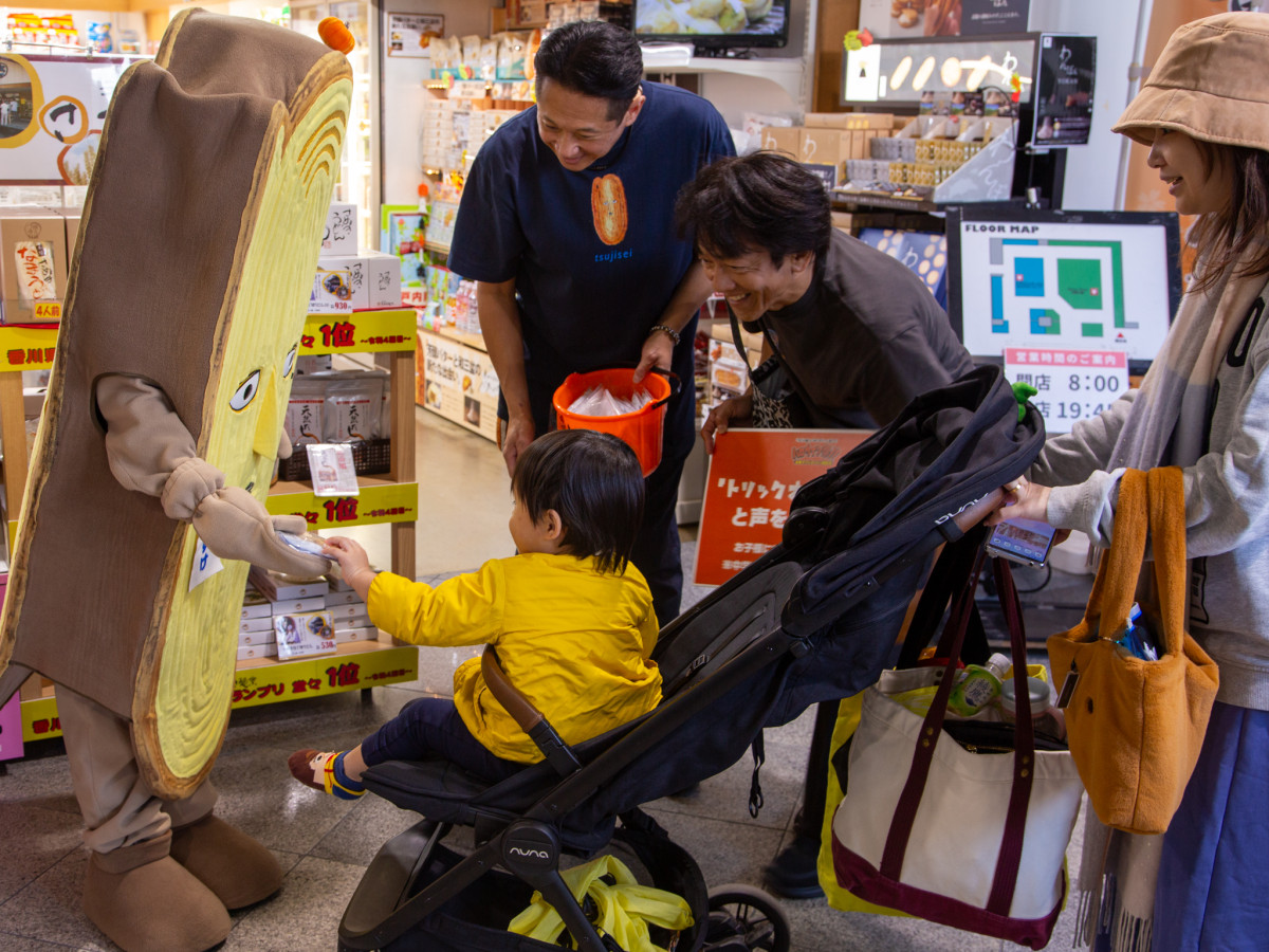 ベビーカーの子どもにお菓子を手渡すぱいすけ=高松空港で「うどん脳F」と「ぱいすけ」ハロウィーングリーティング
