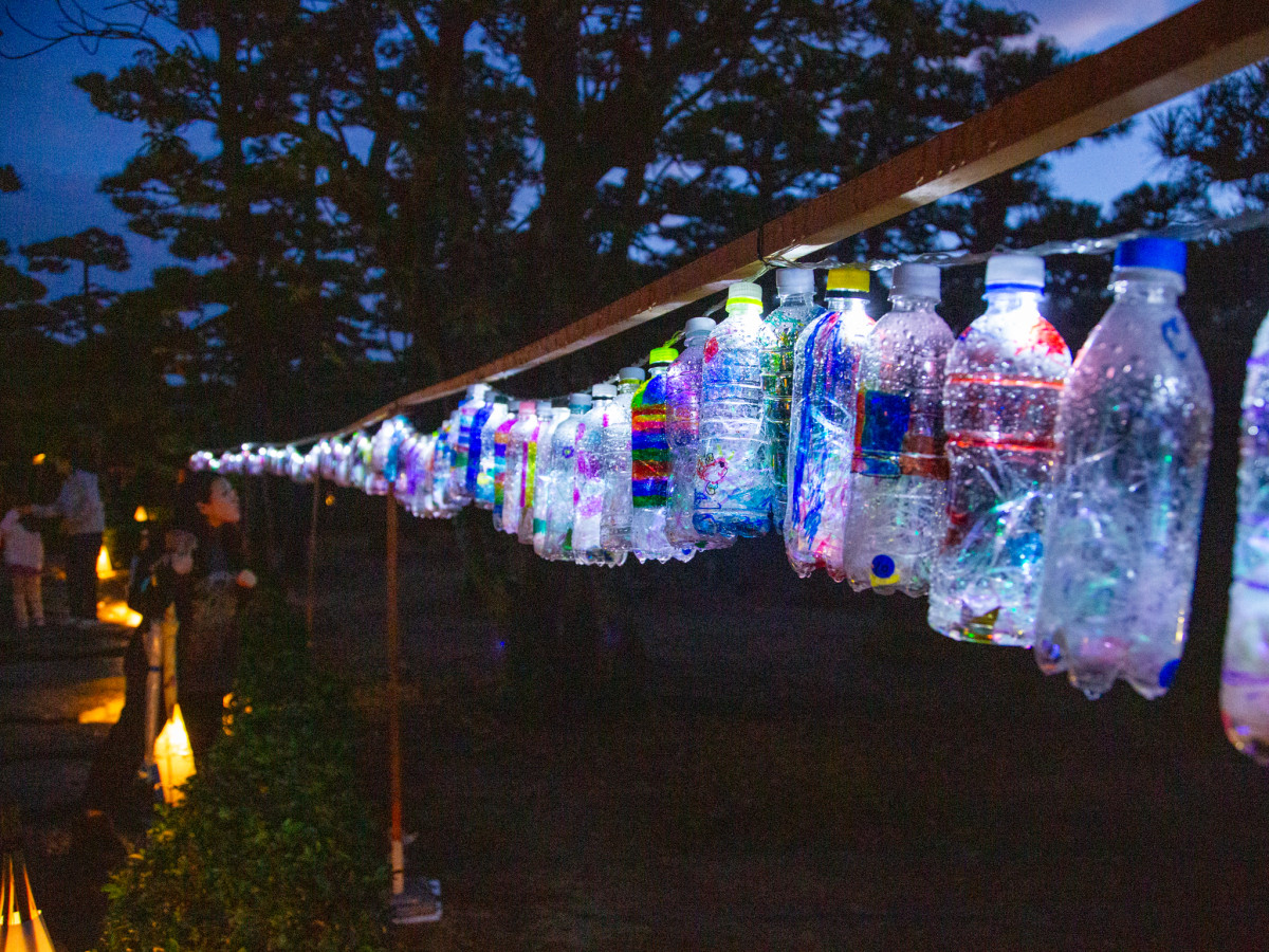 香川大学の学生団体「START」と「SteeeP」が香川県内の幼稚園の園児らと作ったペットボトルの照明=高松・玉藻公園でライトアップイベント「玉藻あかり物語」
