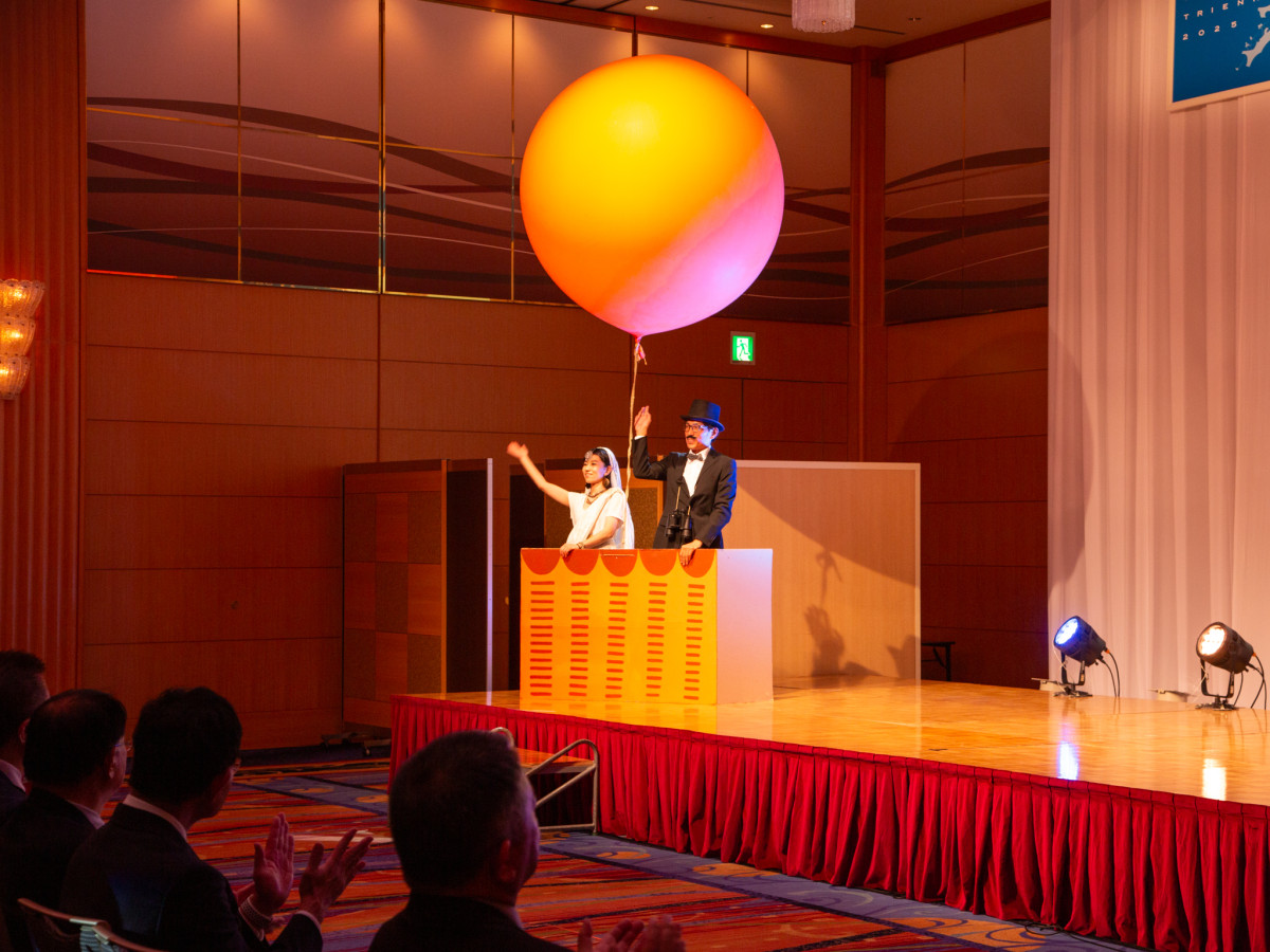 ジュール・ベルヌの小説「80日間世界一周」をモチーフに気球に乗った人物が登場し、会場を巡るストーリーで紹介した=瀬戸内国際芸術祭2025閉幕