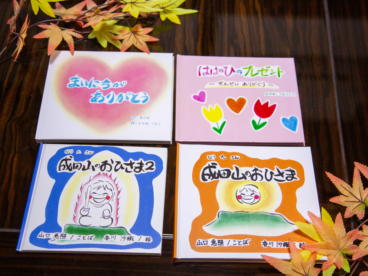 香川さんが個人製作する絵本 仏画の師匠である山口さんの言葉を紹介したものも=さぬき市・霊芝寺で「香川沙織仏画展~静寂と対話~」