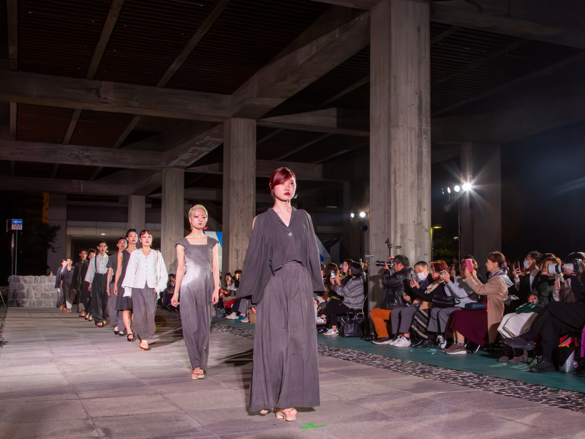 香川県の伝統的工芸品「保多織(ぼたおり)」を用いたファッションショー「瀬戸内の風、パリの光。―帰国ランウェー in 香川」が11月14日、香川県庁東館のピロティで開かれた。