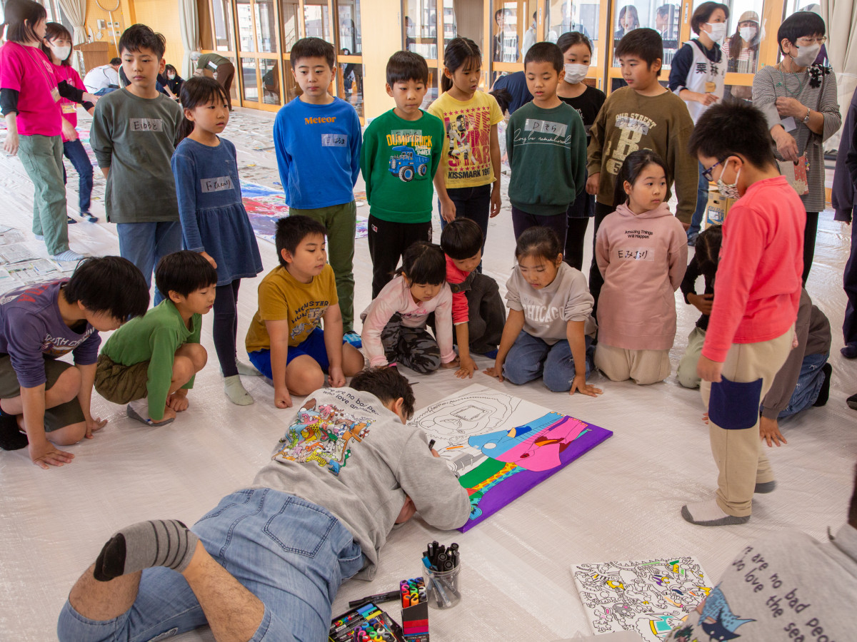 絵を描くTaichiさん、Shotaさんの周りには多くの子どもたちが集まった=栗林小でアートワークショップ「イロいろカラフルアート」