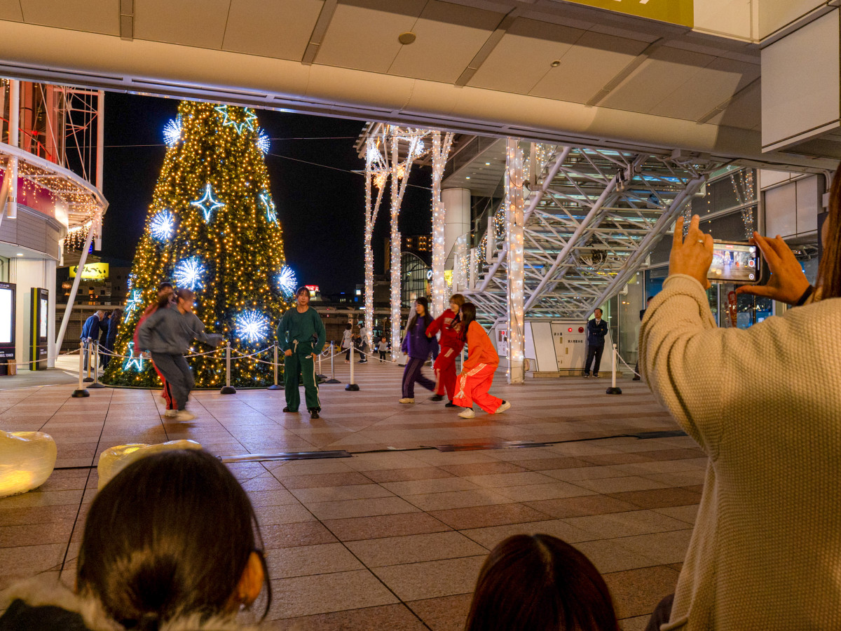 徳島文理大学高松駅キャンパスダンス部のダンスパフォーマンス=高松シンボルタワーに8メートルのクリスマスツリー