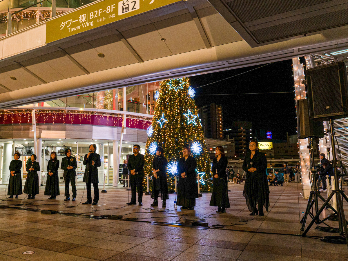 ゴスペルグループ「ARTOS」のステージ=高松シンボルタワーに8メートルのクリスマスツリー