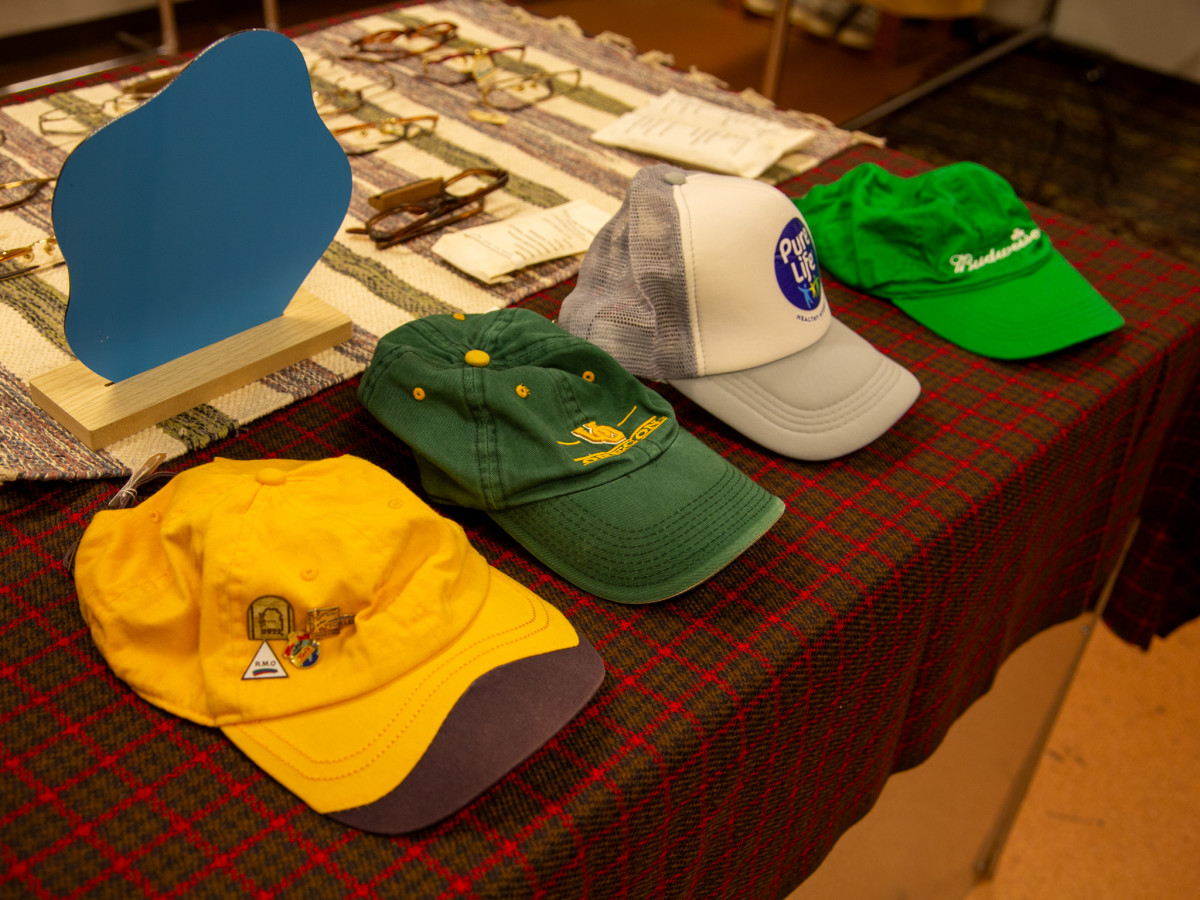 キャップ 手前の黄色いキャップのピンバッジは森さんが付けた=三木町に古着店「skog(スコーグ)」