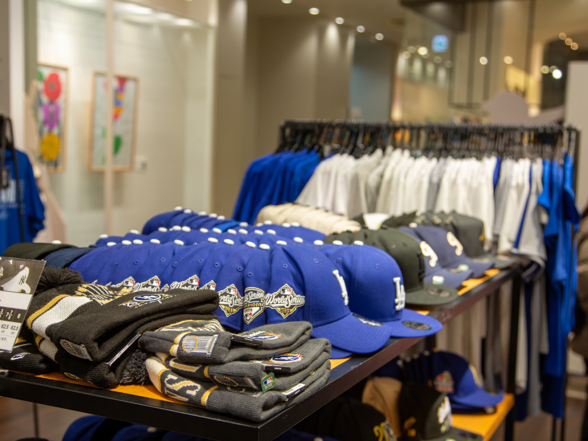 ワールドシリーズのロゴマークが付いたキャップ=丸亀町グリーンでMLBポップアップ