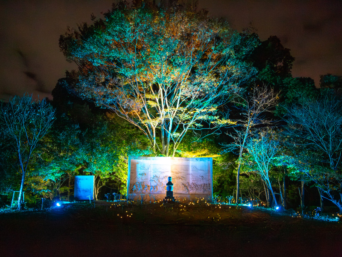 源平合戦壁画周辺をライトアップした「STONE WALL 840」=屋島山上でライトアップとプロジェクションマッピング