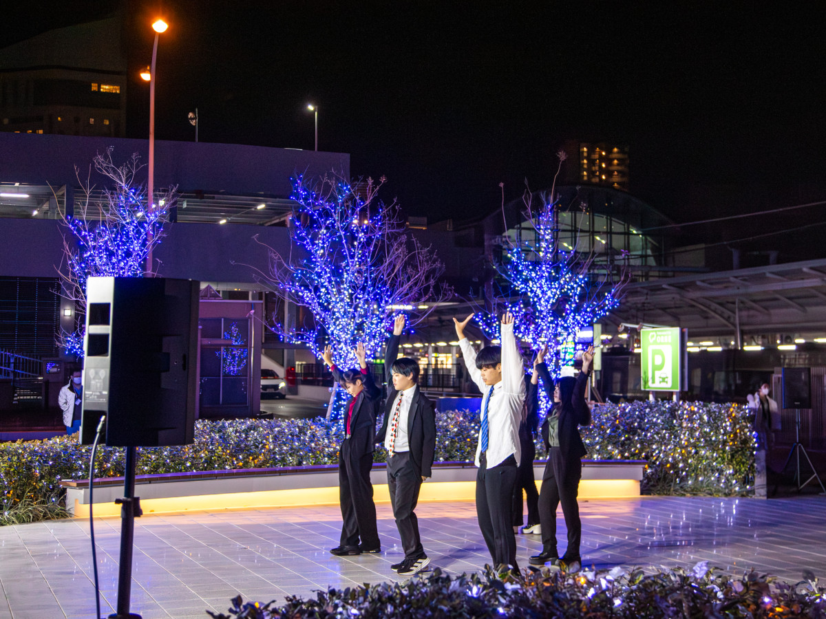ダンス部によるステージ=徳島文理大・高松駅キャンパスでLED3万球のイルミネーション